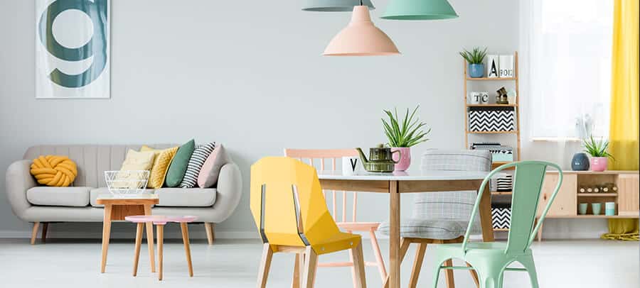 Para uma sala colorida e cheia de vida, que tal adicionar diversas cores pastéis? Uma forma delicada e divertida para pintar sua parede com mais de uma cor. Para não deixar o ambiente tão feminino, prefira desenhar formas geométricas, ou desenhos mais ousados.