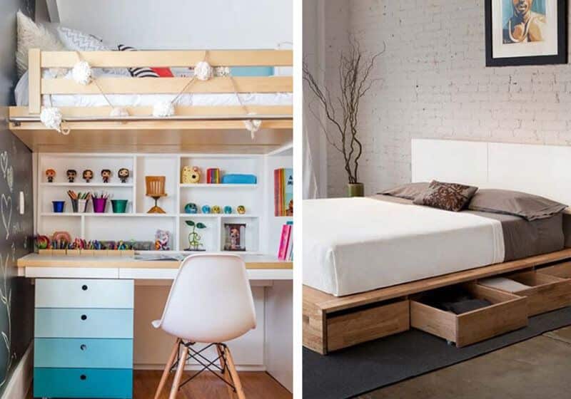 A cama, por exemplo, pode ser mais baixa para que dê a impressão de que o seu pé direito é mais alto. Uma dica legal é utilizar móveis com gavetas embutidas e separadores, assim, mesmo sendo um quarto pequeno, fica mais fácil de mantê-lo organizado.
