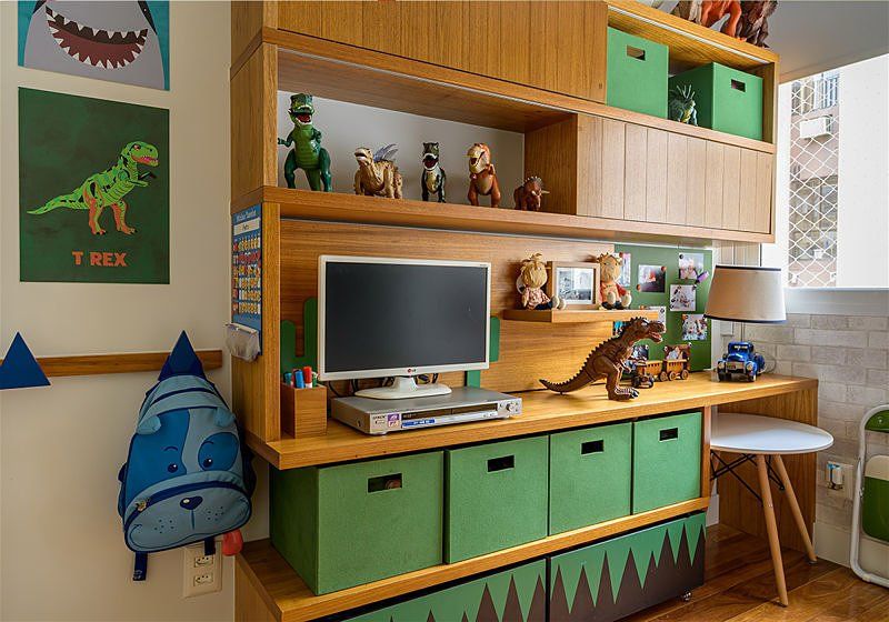 Além de contribuírem para a aparência do espaço, são ótimas aliadas para organizar livros, cadernos e outros materiais de papelaria mais utilizados pelas crianças. Porém, é importante fixá-los em uma altura condizente com a dos seus filhos para que eles tenham a liberdade de alcançarem sozinhos os objetos.