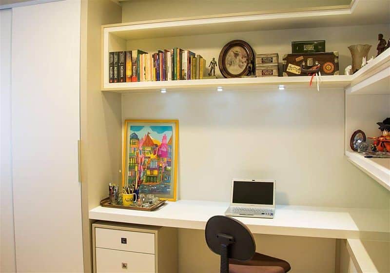 Para escolher a mesa ou a escrivaninha, leve em consideração a largura do espaço escolhido! O importante aqui é preferir aquelas com gavetas para otimizar o espaço e manter os materiais de estudo organizados. Caso você queira apostar em uma bancada, é preciso que ela tenha, no mínimo, 120 cm de largura e 50 cm de profundidade para garantir um espaço adequado.